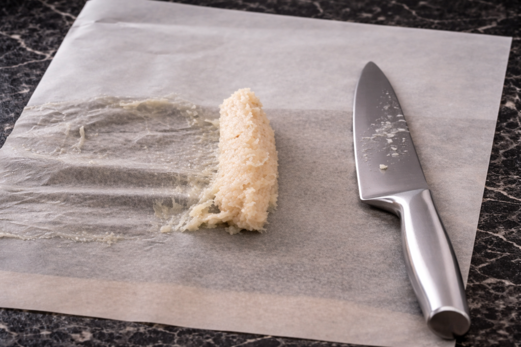 Recouvrir une planche à découper avec du papier cuisson. Déposer ensuite environ 60 g de tasse de pâte de gâteau de poisson sur la surface. Puis aplatir la pâte à l’aide d’un couteau de cuisine afin d’obtenir une forme allongée. Ensuite, rouler délicatement la pâte de gauche à droite avec la lame du couteau. Utiliser les deux côtés de la lame pour guider la forme et obtenir une barre fine et régulière. Si la barre paraît trop épaisse, la couper en deux. Continuer de la même manière jusqu’à utiliser toute la préparation.