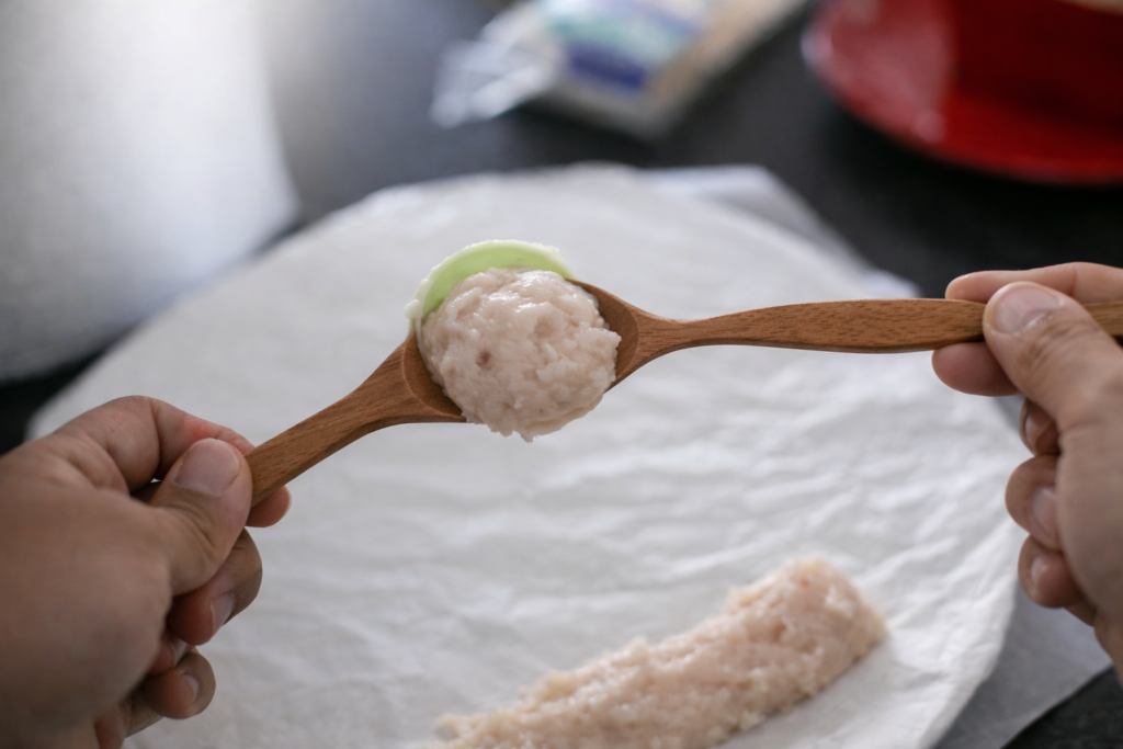 Préparer une ou deux grandes assiettes plates. Ensuite, recouvrir la surface avec du papier cuisson afin d’éviter que la pâte ne colle. Former les gâteaux de poisson coréens (Eomuk) selon la forme souhaitée, puis les déposer sur l’assiette. Les formes les plus courantes restent les boulettes ou les barres fines.